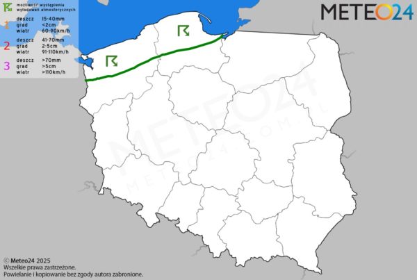 Opis: W ciągu doby nad ciepłymi wodami Morza Bałtyckiego oraz w pasie nadmorskim ponownie mogą rozwijać się pojedyncze komórki i pasma konwekcyjne, które przyniosą ze sobą przelotne oraz ciągłe opady śniegu o zmiennym i silnym natężeniu. Dodatkowo w tej części omawianego obszaru niewykluczone są też lokalne burze śnieżne oraz z opadami gradu lub krupy śnieżnej. W zamian ich głównym zagrożeniem będzie również umiarkowany i silny wiatr w porywach dochodzący do 60-80 km/h.