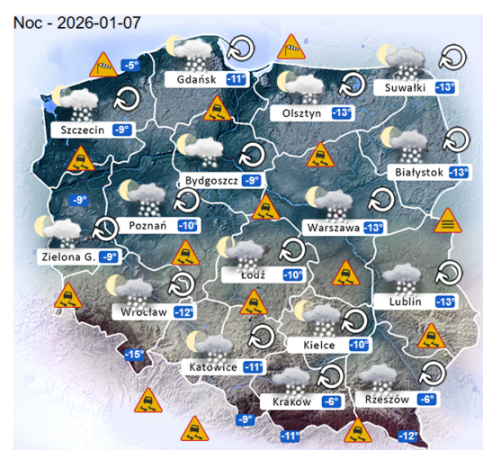 Natomiast we wtorek wieczorem oraz z wtorku na środę w całym naszym kraju oraz nad morzem i w górach nadal możliwe są silne marznące mgły i zamglenia. Poza tym utrzyma się z nami całkowite oraz umiarkowane i duże zachmurzenie z przejaśnieniami, które przyniesie ze sobą kolejne przelotne oraz ciągłe opady śniegu o słabym i bardzo silnym natężeniu. Dodatkowo nad wodami Morza Bałtyckiego i w pasie nadmorskim niewykluczone są też lokalne burze śnieżne oraz z opadami gradu lub krupy śnieżnej. Temperatura powietrza wyniesie od -15°C do -5°C. Wiatr na ogół będzie słaby oraz umiarkowany i dość silny ze zmiennych kierunków z przewagą wiejący od południowego – zachodu oraz z północnego – zachodu i północy. W zamian tego w porywach będzie on dochodzić do 30-60 km/h. Ciśnienie atmosferyczne w kolejnych godzinach będzie rosnąć oraz o północy w Warszawie nad poziomem morza wskaże 1018 hPa.