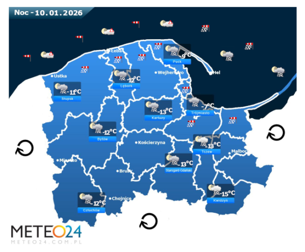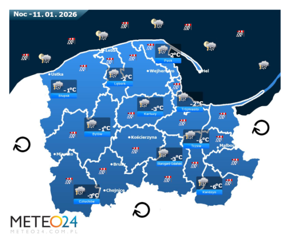 Natomiast w piątek wieczorem oraz w sobotę w ciągu nocy i o poranku na Pomorzu i Wybrzeżu nadal możliwe są silne marznące mgły i zamglenia. W zamian tego utrzyma się z nami całkowite oraz umiarkowane i duże zachmurzenie z przejaśnieniami, które przyniesie ze sobą przelotne oraz ciągłe opady śniegu o zmiennym i silnym natężeniu. Jedynie bez opadów powinno początkowo być w pasie nadmorskim. Temperatura minimalna powietrza wyniesie od -15°C do -7°C. Wiatr na ogół będzie słaby oraz umiarkowany i silny ze zmiennych kierunków z przewagą wiejący od północnego – wschodu oraz ze wschodu i z północnego – zachodu. Dodatkowo w porywach będzie on dochodzić do 60-80 km/h. Szczególnie najbardziej da się on we znaki nad samym morzem. Ciśnienie atmosferyczne w kolejnych godzinach będzie spadać i się wahać oraz o północy na poziomie morza wskaże 1008 hPa.