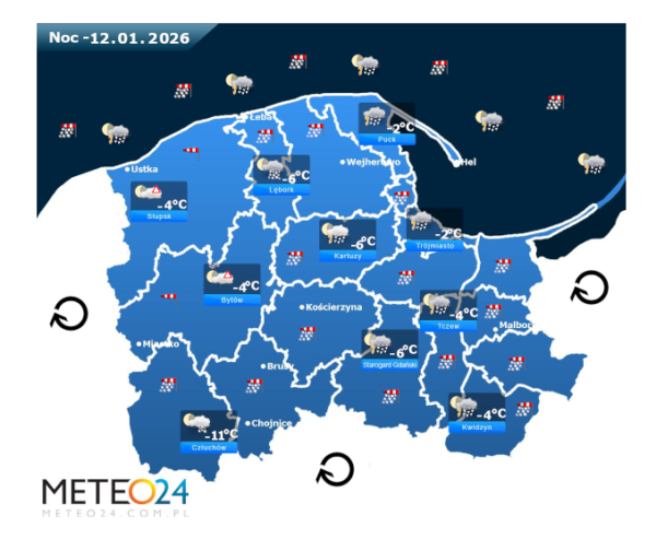 Z kolei w poniedziałek przed południem oraz w ciągu dnia i wieczorem na Pomorzu i Wybrzeżu nadal możliwe są silne marznące mgły i zamglenia. Poza tym utrzyma się z nami umiarkowane i duże zachmurzenie z przejaśnieniami, które przyniesie ze sobą kolejne przelotne oraz ciągłe opady śniegu o zmiennym i silnym natężeniu. Dodatkowo niewykluczone są też burze śnieżne oraz z opadami gradu lub krupy śnieżnej. Jedynie bez opadów powinno być na północnym zachodzie i zachodzie województwa. Temperatura powietrza wyniesie od -2°C do +2°C. Wiatr na ogół będzie słaby oraz umiarkowany i dość silny ze zmiennych kierunków z przewagą wiejący od północnego – zachodu oraz z południowego – zachodu i południowego – wschodu. W zamian tego w porywach będzie on dochodzić do 30-60 km/h. Ciśnienie atmosferyczne w kolejnych godzinach nadal będzie rosnąć oraz w południe na poziomie morza 1017 hPa.