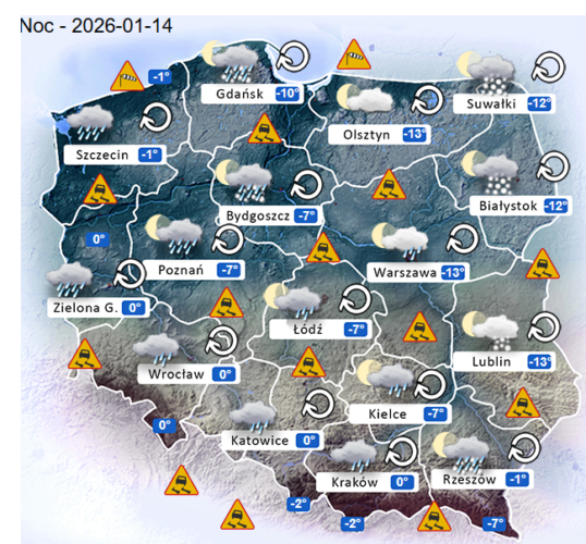 Natomiast z wtorku na środę o poranku w całym naszym kraju oraz nad morzem i w górach nadal mogą rozwijać się silne marznące mgły i zamglenia. Poza tym utrzyma się z nami całkowite oraz umiarkowane i duże zachmurzenie z przejaśnieniami, które przyniesie ze sobą przelotne oraz ciągłe opady marznącego deszczu jak i też deszczu ze śniegiem i śniegu o słabym i silnym natężeniu. Jedynie bez opadów powinno być częściowo na północnym wschodzie Polski. Temperatura powietrza wyniesie od -13°C do 0°C. Wiatr na ogół będzie słaby oraz umiarkowany i dość silny ze zmiennych kierunków z przewagą wiejący od południowego – wschodu oraz z południa południowego – zachodu. Dodatkowo w porywach będzie on dochodzić do 30-60 km/h. Ciśnienie atmosferyczne w kolejnych godzinach będzie się wahać i rosnąć oraz o północy w Warszawie nad poziomem morza wskaże 1021 hPa.