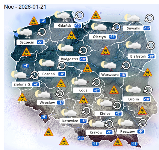 Natomiast noc z wtorku na środę również może przynieść silne marznące mgły lub lokalne zamglenia. W zamian utrzyma się z nami małe i umiarkowane zachmurzenie, które jedynie nad wodami Morza Bałtyckiego i w pasie nadmorskim może przynieść ze sobą symboliczne i na ogół słabe opady śniegu. Temperatura powietrza wyniesie od -16°C do -3°C. Wiatr na ogół będzie słaby oraz umiarkowany i dość silny ze zmiennych kierunków z przewagą wiejący od południowego – wschodu oraz z południowego – zachodu i północnego – zachodu. Dodatkowo w porywach będzie on dochodzić do 30-60 km/h. Ciśnienie atmosferyczne w kolejnych godzinach będzie spadać oraz o północy w Warszawie nad poziomem morza wskaże 1025 hPa.