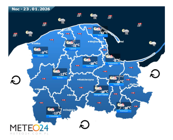 Natomiast noc z czwartku na piątek ponownie może na Pomorzu i Wybrzeżu przynieść silne marznące mgły lub lokalne zamglenia. Poza tym utrzyma się z nami umiarkowane i duże zachmurzenie z przejaśnieniami, które jedynie nad wodami Morza Bałtyckiego i w pasie nadmorskim przyniesie ze sobą przelotne oraz ciągłe opady śniegu o słabym i zmiennym natężeniu. Temperatura powietrza wyniesie od -18°C do -9°C. Wiatr na ogół będzie słaby oraz umiarkowany i dość silny ze zmiennych kierunków z przewagą wiejący ze wschodu oraz z północnego – wschodu i południowego – wschodu. Dodatkowo w porywach będzie on dochodzić do 30-60 km/h. Ciśnienie atmosferyczne w kolejnych godzinach będzie powoli rosnąć oraz o północy na poziomie morza wskaże 1012 hPa.