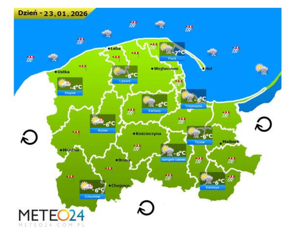 Z kolei w piątek przed południem oraz w ciągu dnia i wieczorem na Pomorzu i Wybrzeżu ponownie mogą rozwijać się silne marznące mgły lub lokalne zamglenia. Poza tym pojawi się całkowite oraz umiarkowane i duże zachmurzenie z przejaśnieniami, które praktycznie wszędzie przyniesie ze sobą przelotne oraz ciągłe opady śniegu o słabym i zmiennym natężeniu. Jedynie bez opadów powinno być na północnym zachodzie oraz też na zachodzie i południowym zachodzie powiatów województwa. Temperatura powietrza wyniesie od -7°C do -4°C. Wiatr na ogół będzie słaby oraz umiarkowany i dość silny ze zmiennych kierunków z przewagą wiejący ze wschodu oraz z północnego – wschodu i południowego – wschodu. Dodatkowo w porywach będzie on dochodzić do 30-60 km/h. Ciśnienie atmosferyczne w kolejnych godzinach będzie początkowo dość stabilne oraz w południe na poziomie morza wskaże 1013 hPa.