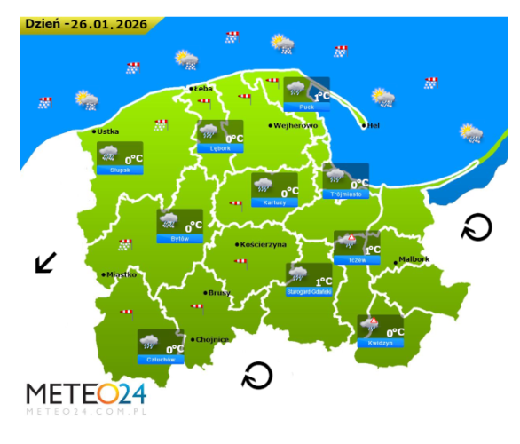W kolejnych godzinach nowego tygodnia pogodę na Pomorzu i Wybrzeżu kształtować będzie układ niskiego ciśnienia z frontem okluzji. Poza tym pojawią się opady marznącego deszczu i deszczu ze śniegiem, które na drogach i chodnikach będą powodować niebezpieczną gołoledź. Poza tym na wody Morza Bałtyckiego i do północnej części Polski napływać będzie mroźne oraz wilgotne i bardzo zróżnicowane powietrze z południowego wschodu i południowego zachodu Europy.