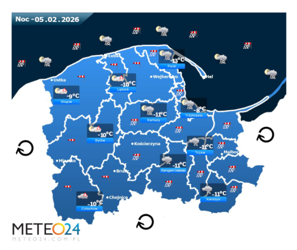 Z kolei w czwartek przed południem oraz w ciągu dnia i wieczorem na Pomorzu i Wybrzeżu nadal możliwe są silne marznące mgły lub lokalne zamglenia. W zamian tego utrzyma się z nami całkowite i duże zachmurzenie z przejaśnieniami, które przyniesie ze sobą kolejne przelotne oraz ciągłe opady marznącego jak i też deszczu ze śniegiem i śniegu o zmiennym i silnym natężeniu. Temperatura powietrza wyniesie od -3°C do -1°C. Wiatr przeważnie będzie umiarkowany i dość silny ze zmiennych kierunków z przewagą wiejący ze wschodu oraz z południowego – wschodu i północnego – wschodu. Dodatkowo w porywach będzie on dochodzić do 35-60 km/h. Ciśnienie atmosferyczne w kolejnych godzinach również będzie spadać oraz w południe na poziomie morza wskaże 1006 hPa.