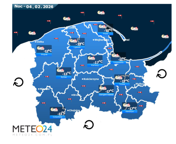 Natomiast noc z wtorku na środę na Pomorzu i Wybrzeżu nadal mogą rozwijać się silne marznące mgły lub lokalne zamglenia. W zamian tego będzie bez opadów oraz między innymi pojawi się małe oraz umiarkowane i duże zachmurzenie z przejaśnieniami. Temperatura powietrza wyniesie od -17°C do -12°C. Wiatr na ogół będzie umiarkowany i dość silny ze zmiennych kierunków z przewagą wiejący ze wschodu oraz z północnego – wschodu i południowego – wschodu. Dodatkowo w porywach będzie on dochodzić do 40-60 km/h. Ciśnienie atmosferyczne w kolejnych godzinach powoli będzie spadać oraz o północy na poziomie morza wskaże 1022 hPa.