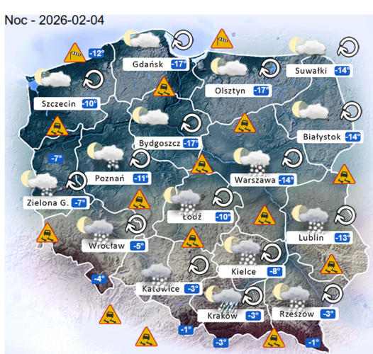 Z kolei w środę przed południem oraz w ciągu dnia i wieczorem w całym naszym kraju oraz nad morzem i w górach nadal możliwe są silne marznące mgły lub lokalne zamglenia. Poza tym utrzyma się z nami całkowite oraz umiarkowane i duże zachmurzenie z przejaśnieniami, które przyniesie ze sobą kolejne przelotne oraz ciągłe opady marznącego deszczu jak i też deszczu ze śniegiem i śniegu o słabym i silnym natężeniu. Jedynie bez opadów powinno być na samym morzem oraz częściowo na zachodzie i Pomorzu. Temperatura powietrza wyniesie od -8°C do +3°C. Wiatr na ogół będzie słaby oraz umiarkowany i dość silny ze zmiennych kierunków z przewagą wiejący od północnego – wschodu oraz ze wschodu i z południowego – wschodu. Dodatkowo w porywach będzie on dochodzić do 30-60 km/h. Ciśnienie atmosferyczne w kolejnych godzinach nadal będzie spadać oraz w południe w Warszawie nad poziomem morza wskaże 1014 hPa.