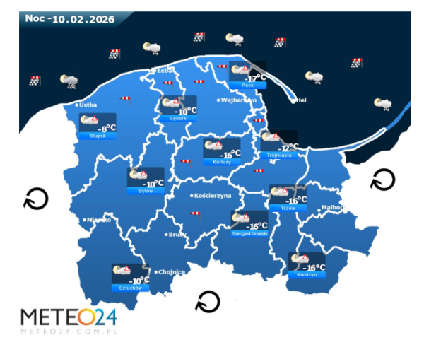 Natomiast noc z poniedziałku na wtorek i poranek na Pomorzu i Wybrzeżu nadal może przynieść silne marznące mgły lub lokalne zamglenia. W zamian tego utrzyma się z nami małe oraz umiarkowane i duże zachmurzenie z przejaśnieniami, które jedynie nad wodami Morza Bałtyckiego i w pasie nadmorskim przyniesie ze sobą przelotne oraz ciągłe opady śniegu o słabym i zmiennym natężeniu. Temperatura powietrza wyniesie od -17°C do -8°C. Wiatr na ogół będzie słaby oraz umiarkowany i dość silny ze zmiennych kierunków z przewagą wiejący od południowego – wschodu oraz z południa i południowego – zachodu. Dodatkowo w porywach będzie on dochodzić do 30-60 km/h. Ciśnienie atmosferyczne w kolejnych godzinach będzie spadać oraz o północy na poziomie morza wskaże 1015 hPa.