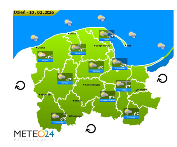 Z kolei we wtorek przed południem oraz w ciągu dnia i wieczorem na Pomorzu i Wybrzeżu nadal mogą rozwijać się silne marznące mgły lub lokalne zamglenia. Poza tym utrzyma się z nami umiarkowane i duże zachmurzenie z przejaśnieniami, które jedynie nad wodami Morza Bałtyckiego i w pasie nadmorskim przyniesie ze sobą kolejne przelotne oraz ciągłe opady śniegu o zmiennym natężeniu. Temperatura powietrza wyniesie od -1°C do 0°C. Wiatr na ogół będzie słaby ze zmiennych kierunków z przewagą wiejący od południowego – zachodu oraz z południa i południowego – wschodu. Ciśnienie atmosferyczne w kolejnych godzinach również będzie spadać oraz w południe na poziomie morza wskaże 1006 hPa.