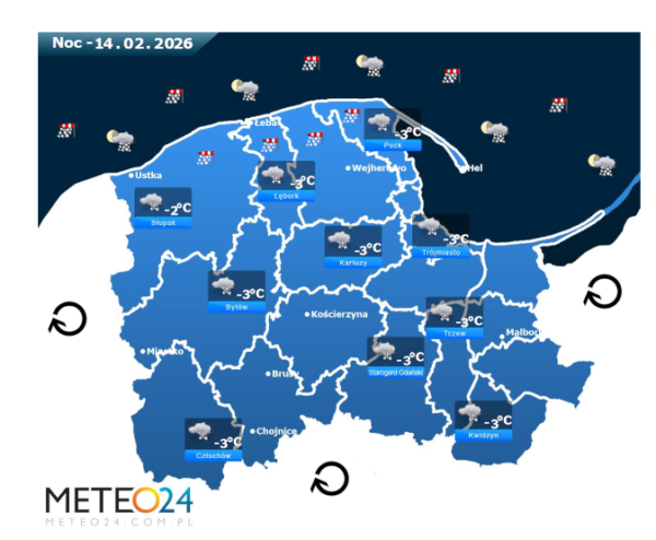 Natomiast noc z piątku na sobotę i poranek na Pomorzu i Wybrzeżu nadal może przynieść silne marznące mgły lub lokalne zamglenia. W zamian tego utrzyma się z nami całkowite i duże zachmurzenie z przejaśnieniami, które przyniesie ze sobą przelotne oraz ciągłe opady śniegu o słabym i zmiennym natężeniu. Temperatura powietrza wyniesie od -3°C do -2°C. Wiatr na ogół będzie słaby oraz umiarkowany i dość silny ze zmiennych kierunków z przewagą wiejący od północy oraz z północnego – wschodu i północnego – zachodu. Dodatkowo w porywach będzie on dochodzić do 30-60 km/h. Ciśnienie atmosferyczne w kolejnych godzinach będzie rosnąć oraz o północy na poziomie morza wskaże 992 hPa.