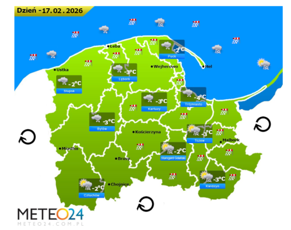 W kolejnych godzinach nowego tygodnia a dokładnie we wtorek pogodę na Pomorzu i Wybrzeżu nadal kształtować będzie układ niskiego ciśnienia z kolejnymi frontami atmosferycznymi, który przyniesie ze sobą opady śniegu. W zamian tego nad wody Morza Bałtyckiego i do północnej części Polski napływać będzie mroźne i wilgotne powietrze prosto z północy i północnego zachodu Europy.
