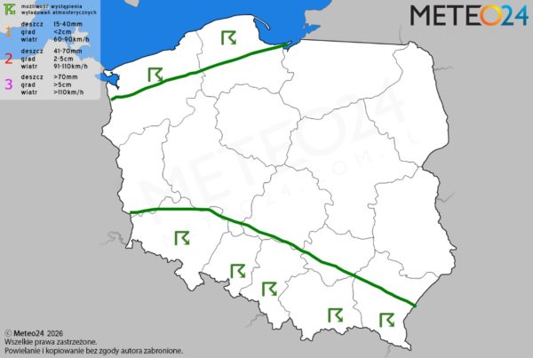 Opis: W ciągu doby nad wodami Morza Bałtyckiego oraz w pasie nadmorskim na południu Polski i w górach mogą rozwijać się pojedyncze komórki i pasma konwekcyjne, które przyniosą ze sobą przelotne oraz ciągłe opady śniegu o zmiennym i silnym natężeniu. Dodatkowo w tej części omawianego obszaru niewykluczone są też lokalne burze śnieżne oraz z opadami gradu lub krupy śnieżnej. W zamian ich głównym zagrożeniem będzie umiarkowany i silny wiatr w porywach dochodzący do 60-80 km/h.