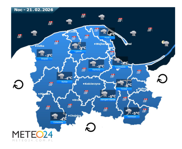 Natomiast noc z piątku na sobotę i poranek na Pomorzu i Wybrzeżu nadal może przynieść silne marznące mgły lub lokalne zamglenia. Poza tym utrzyma się z nami całkowite i duże zachmurzenie z przejaśnieniami, które przyniesie ze sobą przelotne oraz ciągłe opady śniegu o słabym i silnym natężeniu. Temperatura powietrza wyniesie od -5°C do -3°C. Wiatr na ogół będzie umiarkowany i silny ze zmiennych kierunków z przewagą wiejący od południa oraz z południowego – wschodu i południowego – zachodu. Dodatkowo w porywach będzie on dochodzić do 60-80 km/h. Ciśnienie atmosferyczne w kolejnych godzinach będzie wyraźnie się wahać i spadać oraz o północy na poziomie morza wskaże 1024 hPa.