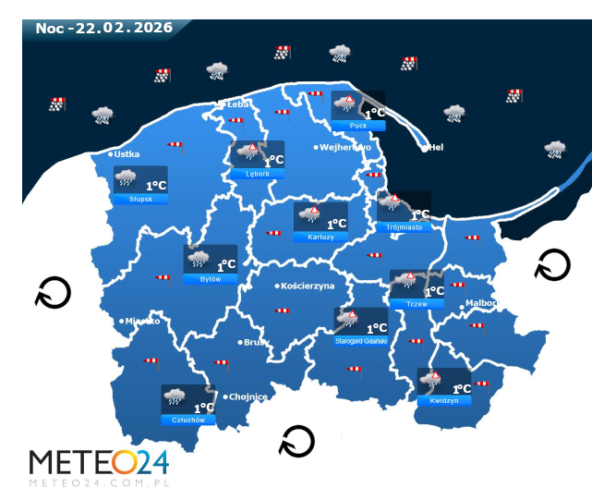 Natomiast noc z soboty na niedzielę i o poranku na Pomorzu i Wybrzeżu nadal mogą rozwijać się silne marznące mgły lub lokalne zamglenia. Poza tym utrzyma się z nami całkowite zachmurzenie, które przyniesie ze sobą przelotne oraz ciągłe opady marznącego deszczu i deszczu ze śniegiem o słabym i silnym natężeniu. Temperatura powietrza wyniesie w okolicach +1°C. Wiatr na ogół będzie umiarkowany i silny ze zmiennych kierunków z przewagą wiejący od południowego – zachodu. Dodatkowo w porywach będzie on dochodzić do 60-80 km/h. Ciśnienie atmosferyczne w kolejnych godzinach nadal będzie się spadać i się wahać oraz o północy na poziomie morza wskaże 1011 hPa.