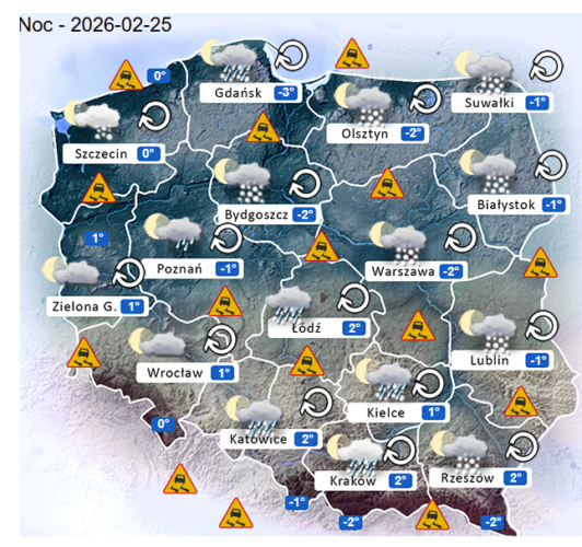 Natomiast noc z wtorku na środę i poranek również przyniesie silne marznące mgły lub lokalne zamglenia. W zamian tego utrzyma się z nami całkowite oraz umiarkowane i duże zachmurzenie z przejaśnieniami, które przyniesie ze sobą przelotne oraz ciągłe opady marznącego deszczu jak i też deszczu ze śniegiem i śniegu o słabym i silnym natężeniu. Dodatkowo w górach i na południu Polski niewykluczone są również lokalne burze śnieżne oraz z opadami gradu lub krupy śnieżnej. Jedynie bez opadów powinno być częściowo na zachodzie i południowym zachodzie naszego kraju. Temperatura powietrza wyniesie od -3°C do +1°C. Wiatr na ogół będzie słaby oraz umiarkowany i dość silny ze zmiennych kierunków z przewagą wiejący od północnego – zachodu oraz z zachodu i północy. W zamian tego w porywach będzie on dochodzić do 30-60 km/h. Ciśnienie atmosferyczne w kolejnych godzinach będzie rosnąć oraz o północy w Warszawie nad poziomem morza wskaże 1021 hPa.
