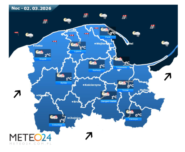 Natomiast noc z niedzieli na poniedziałek i poranek również na Pomorzu i Wybrzeżu przyniesie silne marznące mgły lub lokalne zamglenia. W zamian tego utrzyma się z nami małe i umiarkowane zachmurzenie, której jedynie nad wodami Morza Bałtyckiego i w pasie nadmorskim przyniesie ze sobą przelotne oraz ciągłe opady marznącego deszczu i deszczu ze śniegiem o słabym natężeniu. Temperatura powietrza wyniesie od 0°C do +2°C. Wiatr na ogół będzie słaby oraz umiarkowany i dość silny z południowego – zachodu. Dodatkowo w porywach będzie on dochodzić do 30-60 km/h. Ciśnienie atmosferyczne w kolejnych godzinach będzie rosnąć oraz o północy na poziomie morza wskaże 1024 hPa.