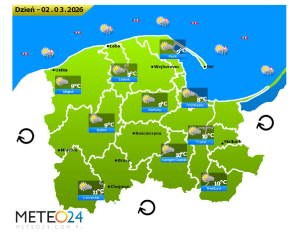 Z kolei w poniedziałek przed południem oraz w ciągu dnia i wieczorem na Pomorzu i Wybrzeżu nadal możliwe są silne mgły lub lokalne zamglenia. Poza tym pojawi się duże zachmurzenie z przejaśnieniami, które jedynie nad wodami Morza Bałtyckiego i w pasie nadmorskim przyniesie ze sobą kolejne przelotne oraz ciągłe opady deszczu lub mżawki o zmiennym i silnym natężeniu. Temperatura powietrza wyniesie od +8°C do +11°C. Wiatr na ogół będzie słaby oraz umiarkowany i dość silny ze zmiennych kierunków z przewagą wiejący od południowego – zachodu oraz z zachodu i północnego – zachodu. Dodatkowo nad samym morzem w porywach może on dochodzić do 40-60 km/h. Ciśnienie atmosferyczne w kolejnych godzinach nadal będzie pomału rosnąć oraz w południe na poziomie morza wskaże 1025 hPa.