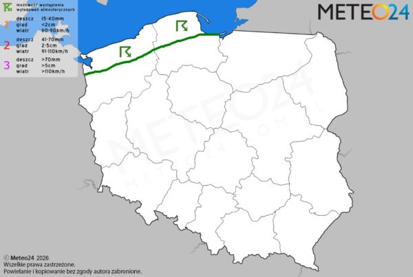 Opis: W ciągu doby nad wodami Morza Bałtyckiego oraz w pasie nadmorskim mogą rozwijać się pojedyncze komórki i pasma konwekcyjne, które przyniosą ze sobą przelotne oraz ciągłe opady deszczu o zmiennym i silnym natężeniu. Dodatkowo w tej części omawianego obszaru niewykluczone są też lokalne burze z opadami gradu lub krupy śnieżnej. W zamian ich głównym zagrożeniem na tym obszarze będzie umiarkowany i dość silny wiatr w porywach dochodzący do 40-60 km/h.