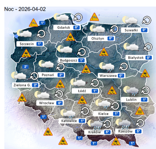 Natomiast noc z środy na czwartek i poranek również w całym naszym kraju oraz nad morzem i w górach może przynieść silne marznące mgły lub lokalne zamglenia. Poza tym utrzyma się z nami bezchmurne niego oraz między innymi pojawi się też umiarkowane i duże zachmurzenie z przejaśnieniami, które jedynie w górach oraz na południu w Centrum na wschodzie i południowym wschodzie Polski przyniesie ze sobą przelotne oraz ciągłe opady marznącego deszczu i deszczu ze śniegiem o słabym i silnym natężeniu. Temperatura powietrza wyniesie od 0°C do +5°C. Wiatr na ogół będzie słaby oraz umiarkowany i dość silny ze zmiennych kierunków z przewagą wiejący od północy oraz z południowego – zachodu i południowego – wschodu. Dodatkowo w porywach może on dochodzić do 30-60 km/h. Ciśnienie atmosferyczne w kolejnych godzinach będzie pomału spadać oraz o północy w Warszawie nad poziomem morza wskaże 1020 hPa.