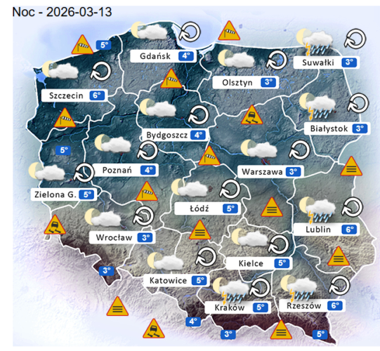 Natomiast noc z czwartku na piątek i poranek w całym naszym kraju oraz nad morzem i w górach również może przynieść silne marznące mgły lub lokalne zamglenia. W zamian tego utrzyma się z nami małe i umiarkowane zachmurzenie, które jedynie w górach na południu oraz na częściowo na północnym wschodzie i wschodzie Polski przyniesie ze sobą przelotne oraz ciągłe opady deszczu o zmiennym i silnym natężeniu. Dodatkowo na tym obszarze niewykluczone są też lokalne burze z gradem lub krupą śnieżną. Temperatura powietrza wyniesie od +3°C do +6°C. Wiatr na ogół będzie słaby oraz umiarkowany i silny ze zmiennych kierunków z przewagą wiejący od południowego – zachodu oraz z południa i północnego – zachodu. Poza tym w pasie nadmorskim oraz na zachodzie i północy Polski w porywach będzie on dochodzić do 60-80 km/h. Ciśnienie atmosferyczne w kolejnych godzinach będzie początkowo rosnąć i się wahać oraz o północy w Warszawie nad poziome morza wskaże 1022 hPa.