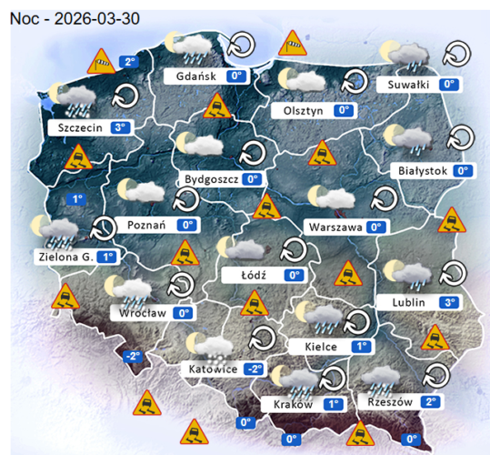 Z kolei w poniedziałek przed południem oraz w ciągu dnia i wieczorem w całym naszym kraju oraz nad morzem i w górach ponownie możliwe są silne mgły lub lokalne zamglenia. Poza utrzyma się z nami całkowite oraz umiarkowane i duże zachmurzenie z przejaśnieniami, które przyniesie ze sobą kolejne przelotne oraz ciągłe opady deszczu i deszczu ze śniegiem o słabym i silnym natężeniu. Dodatkowo niewykluczone są też lokalne burze śnieżne oraz z opadami gradu lub krupy śnieżnej. Temperatura powietrza wyniesie od +3°C do +10°C. Wiatr na ogół będzie słaby oraz umiarkowany i dość silny ze zmiennych kierunków z przewagą wiejący od południowego – zachodu oraz z południa i północnego – zachodu. W zamian tego w porywach może on dochodzić do 30-60 km/h. Ciśnienie atmosferyczne w kolejnych godzinach nadal będzie się wahać i spadać oraz w południe w Warszawie nad poziomem morza wskaże 1013 hPa.