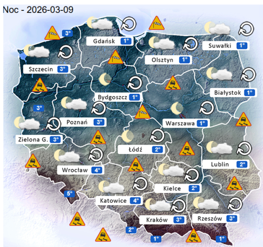 Natomiast noc z niedzieli na poniedziałek i poranek również może przynieść silne marznące mgły lub lokalne zamglenia. W zamian tego będzie bez opadów oraz między innymi pojawi się pogodne niebo i umiarkowane zachmurzenie. Temperatura powietrza wyniesie od +1°C do +4°C. Wiatr na ogół będzie słaby oraz umiarkowany i dość silny ze zmiennych kierunków z przewagą wiejący od południowego – wschodu oraz z południa i południowego – zachodu. Dodatkowo w porywach będzie on dochodzić do 30-60 km/h. Ciśnienie atmosferyczne w kolejnych godzinach nadal będzie wysokie i wyraźnie wahające oraz o północy w Warszawie nad poziomem morza wskaże aż 1033 hPa.
