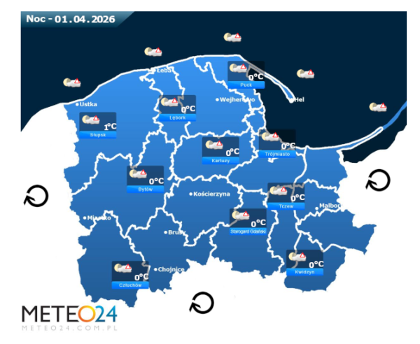 Natomiast noc z wtorku na środę i poranek na Pomorzu i Wybrzeżu nadal może przynieść silne marznące mgły lub lokalne zamglenia. W zamian tego będzie bez opadów oraz między innymi też pojawi się umiarkowane zachmurzenie. Temperatura powietrza wyniesie od 0°C do +1°C. Wiatr na ogół będzie słaby i umiarkowany ze zmiennych kierunków z przewagą wiejący od północnego – zachodu oraz z północnego – wschodu i południowego – wschodu. Ciśnienie atmosferyczne w kolejnych godzinach będzie rosnąć oraz o północy na poziomie morza wskaże 1022 hPa.