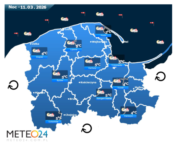 Natomiast noc z wtorku na środę i poranek na Pomorzu i Wybrzeżu również może przynieść silne marznące mgły lub lokalne zamglenia. W zamian tego będzie jeszcze bez opadów oraz między innymi pojawi się małe oraz też umiarkowane i duże zachmurzenie z przejaśnieniami. Temperatura powietrza wyniesie od +3°C do +6°C. Wiatr na ogół będzie słaby oraz umiarkowany i dość silny ze zmiennych kierunków z przewagą wiejący od południowego – zachodu oraz z zachodu i południa. Dodatkowo w porywach będzie on dochodzić do 30-60 km/h. Ciśnienie atmosferyczne w kolejnych godzinach będzie pomału będzie spadać oraz o północy na poziomie morza wskaże 1016 hPa.