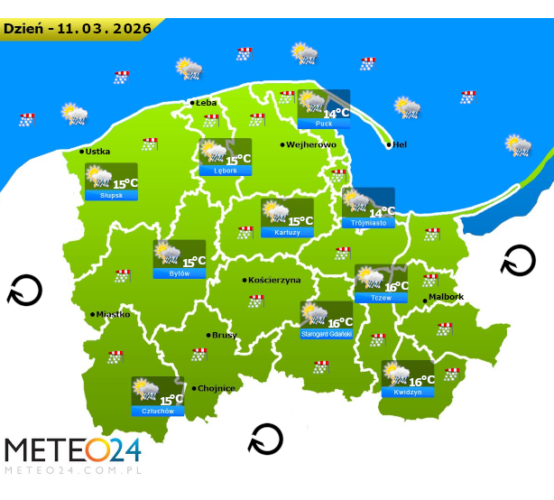 Z kolei w środę przed południem oraz w ciągu dnia i wieczorem na Pomorzu i Wybrzeżu również możliwe są silne mgły lub lokalne zamglenia. Poza tym utrzyma się z nami umiarkowane i duże zachmurzenie z przejaśnieniami, które przyniesie ze sobą przelotne oraz ciągłe opady deszczu o zmiennym i silnym natężeniu. Dodatkowo niewykluczone są też lokalne burze z gradem lub krupą śnieżną. Temperatura powietrza wyniesie od +14°C do nawet +16°C. Wiatr na ogół będzie słaby oraz umiarkowany i dość silny ze zmiennych kierunków z przewagą wiejący od południa i z południowego – zachodu. W zamian tego w porywach będzie on dochodzić do 30-60 km/h. Ciśnienie atmosferyczne w kolejnych godzinach będzie nadal spadać i się wahać oraz w południe na poziomie morza wskaże 1015 hPa.