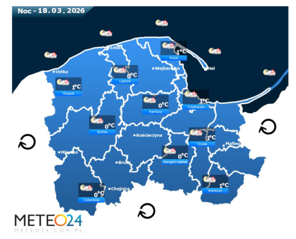 Natomiast noc z wtorku na środę i o poranek na Pomorzu i Wybrzeżu nadal może przynieść silne marznące mgły lub lokalne zamglenia. Poza tym będzie bez opadów oraz dodatkowo pojawi się małe i umiarkowane zachmurzenie. Temperatura powietrza wyniesie od 0°C do +1°C. Wiatr na ogół będzie słaby i umiarkowany ze zmiennych kierunków z przewagą wiejący od północnego – wschodu oraz z północy i południowego – wschodu. Ciśnienie atmosferyczne w kolejnych godzinach będzie rosnąć oraz o północy na poziomie morza wskaże 1029 hPa.