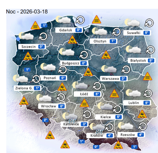 Natomiast noc z wtorku na środę i poranek w całym naszym kraju oraz nad morzem i w górach również może przynieść silne marznące mgły lub lokalne zamglenia. W zamian tego utrzyma się z nami małe oraz umiarkowane i duże zachmurzenie z przejaśnieniami, które jedynie w górach i na południu Polski przyniesie ze sobą przelotne oraz ciągłe opady marznącego deszczu i deszczu ze śniegiem o zmiennym i silnym natężeniu. Dodatkowo na tym obszarze niewykluczone są też lokalne burze śnieżne oraz z opadami gradu lub krupy śnieżnej. Temperatura powietrza wyniesie od 0°C do +5°C. Wiatr na ogół będzie słaby oraz umiarkowany i dość silny ze zmiennych kierunków z przewagą wiejący od północnego – wschodu oraz z południowego – wschodu i północnego – zachodu. Poza tym w porywach może on dochodzić do 30-60 km/h. Ciśnienie atmosferyczne w kolejnych godzinach będzie pomału rosnąć oraz o północy w Warszawie nad poziomem morza wskaże 1026 hPa.