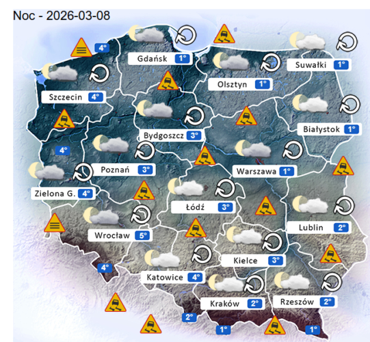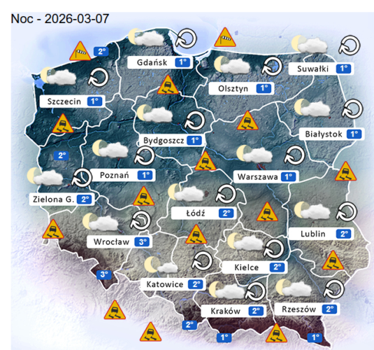 Natomiast noc z piątku na sobotę i poranek również w całym naszym kraju oraz nad morzem i w górach może przynieść silne marznące mgły lub lokalne zamglenia. W zamian tego będzie bez opadów oraz między innymi utrzyma się z nami bezchmurne niebo oraz też małe i umiarkowane zachmurzenie. Temperatura powietrza wyniesie od +1°C do +3°C. Wiatr na ogół będzie słaby oraz umiarkowany i dość silny ze zmiennych kierunków z przewagą wiejący od południowego – wschodu oraz z południa i południowego – wschodu. Dodatkowo w porywach może on dochodzić do 30-60 km/h. Szczególnie najsilniej powieje wzdłuż pasa nadmorskiego. Ciśnienie atmosferyczne w kolejnych godzinach nadal będzie wysokie oraz rosnące i wahające o północy w Warszawie nad poziomem morza wskazując aż 1030 hPa.