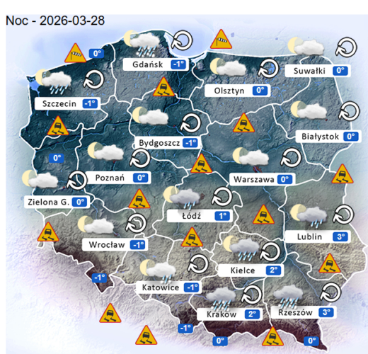 Natomiast noc z piątku na sobotę i o poranku w całym naszym kraju oraz nad morzem i w górach również mogą rozwijać się silne marznące mgły lub lokalne zamglenia. W zamian tego utrzyma się z nami całkowite oraz umiarkowane i duże zachmurzenie z przejaśnieniami, które przyniesie ze sobą przelotne oraz ciągłe opady marznącego deszczu i deszczu ze śniegiem o słabym i silnym natężeniu. Jedynie bez opadów powinno być częściowo na zachodzie w Centrum i na północnym wschodzie Polski. Temperatura powietrza wyniesie od -1°C do +3°C. Wiatr na ogół będzie słaby oraz umiarkowany i dość silny ze zmiennych kierunków z przewagą wiejący od północy oraz z południowego – zachodu i północnego – zachodu. Dodatkowo w porywach może dochodzić do 30-60 km/h. Ciśnienie atmosferyczne w kolejnych godzinach będzie się wahać i rosnąć oraz o północy w Warszawie nad poziomem morza wskaże 1018 hPa.