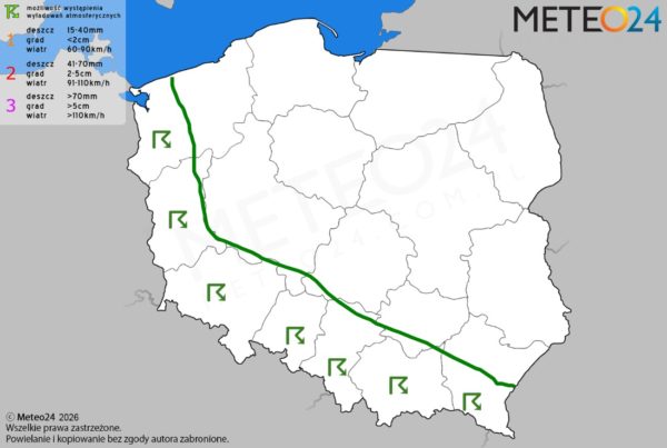 Opis: W ciągu doby częściowo na zachodzie i południu Polski mogą rozwijać się pojedyncze komórki i pasma konwekcyjne, które przyniosą ze sobą przelotne opady deszczu o zmiennym i silnym natężeniu. Dodatkowo w tej części omawianego obszaru niewykluczone są też lokalne burze z opadami gradu lub krupy śnieżnej. W zamian ich głównym zagrożeniem na tym obszarze będzie umiarkowany i dość silny wiatr w porywach dochodzący do 40-60 km/h.