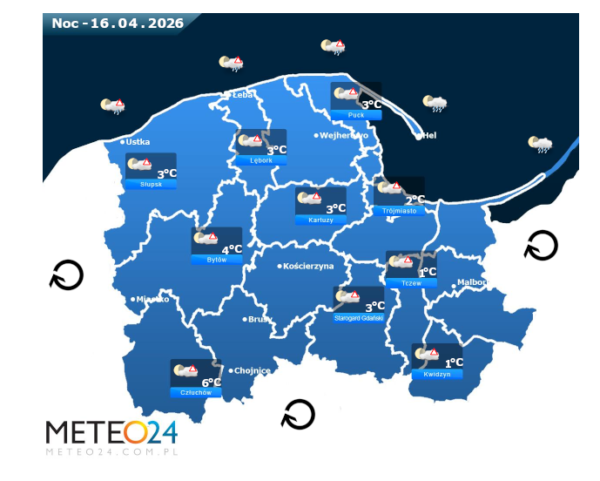 Natomiast noc z środy na czwartek i poranek ponownie na Pomorzu i Wybrzeżu może przynieść silne marznące mgły lub lokalne zamglenia. W zamian tego utrzyma się z nami małe oraz umiarkowane i duże zachmurzenie z przejaśnieniami, które jedynie nad wodami Morza Bałtyckiego i w pasie nadmorskim przyniesie ze sobą przelotne oraz ciągłe opady deszczu lub mżawki o słabym i silnym natężeniu. Temperatura powietrza wyniesie od +1°C do +6°C. Wiatr na ogół będzie słaby i umiarkowany ze zmiennych kierunków z przewagą wiejący od północnego – zachodu oraz z południowego – zachodu i zachodu. Ciśnienie atmosferyczne w kolejnych godzinach będzie pomału spadać oraz o północy na poziomie morza wskaże 1023 hPa.