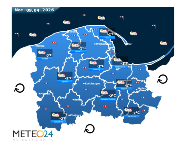 Natomiast noc z środy na czwartek i poranek na Pomorzu i Wybrzeżu nadal może przynieść silne marznące mgły lub lokalne zamglenia. W zamian tego będzie bez opadów oraz między innymi pojawi się małe i umiarkowane zachmurzenie. Temperatura powietrza wyniesie od -2°C do 0°C. Wiatr na ogół będzie słaby oraz umiarkowany i dość silny ze zmiennych kierunków z przewagą wiejący od północnego – wschodu oraz z północy i północnego – zachodu. Dodatkowo w porywach może on dochodzić 30-60 km/h. Ciśnienie atmosferyczne w kolejnych godzinach będzie wysokie i wahające oraz o północy na poziomie morza wskaże 1028 hPa.