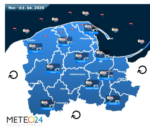Natomiast noc z czwartku na piątek i poranek również na Pomorzu i Wybrzeżu może przynieść silne marznące mgły lub lokalne zamglenia. W zamian tego utrzyma się z nami duże zachmurzenie z przejaśnieniami, które przyniesie ze sobą przelotne oraz ciągłe opady deszczu lub mżawki o zmiennym i silnym natężeniu. Temperatura powietrza wyniesie od +3°C do +4°C. Wiatr na ogół będzie słaby oraz umiarkowany i dość ze zmiennych kierunków z przewagą wiejący od południowego – zachodu oraz z północy i południowego – wschodu. Dodatkowo w porywach może on dochodzić do 30-60 km/h. Ciśnienie atmosferyczne w kolejnych godzinach będzie spadać oraz o północy na poziomie morza wskaże 1013 hPa.