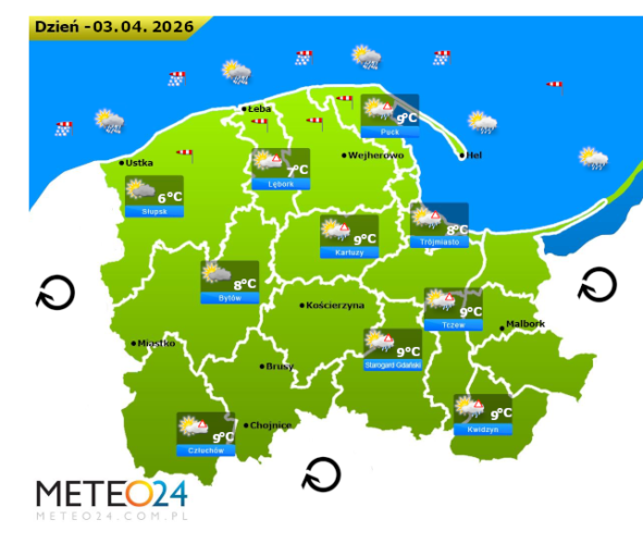 Z kolei w piątek przed południem oraz w ciągu dnia i wieczorem na Pomorzu i Wybrzeżu ponownie możliwe są silne mgły lub lokalne zamglenia. Poza tym pojawi się umiarkowane i duże zachmurzenie z przejaśnieniami, które jedynie w pasie nadmorskim oraz w centrum na wschodzie i południowym wschodzie województwa przyniesie ze sobą przelotne opady deszczu i deszczu ze śniegiem o słabym i silnym natężeniu. Temperatura powietrza wyniesie od +6°C do +9°C. Wiatr na ogół będzie słaby oraz umiarkowany i dość silny ze zmiennych kierunków z przewagą wiejący od południowego – zachodu oraz z zachodu i północnego – zachodu. Dodatkowo w porywach może on dochodzić do 30-60 km/h. Ciśnienie atmosferyczne w kolejnych godzinach będzie ponownie rosnąć i wyraźnie się wahać oraz w południe na poziomie morza wskaże 1012 hPa.