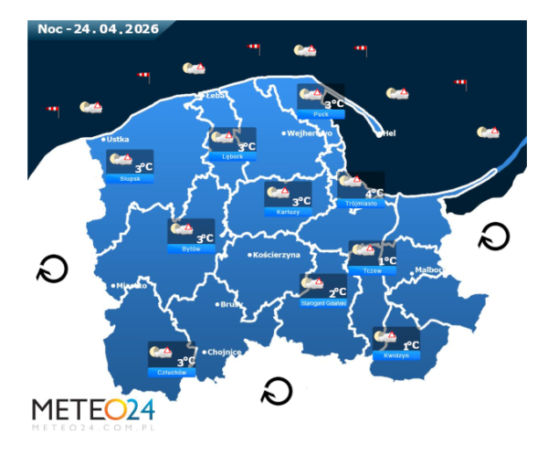 Natomiast noc z czwartku na piątek i poranek na Pomorzu i Wybrzeżu ponownie może przynieść silne marznące mgły lub lokalne zamglenia. Poza tym będzie bez opadów oraz między innymi utrzyma się z nami małe i umiarkowane zachmurzenie. Temperatura powietrza wyniesie od +1°C do +4°C. Wiatr na ogół będzie słaby oraz umiarkowany i dość silny ze zmiennych kierunków od północnego – zachodu oraz z południowego – zachodu i zachodu. Dodatkowo w porywach może on dochodzić do 30-60 km/h. Ciśnienie atmosferyczne w kolejnych godzinach będzie pomału spadać i się wahać oraz o północy na poziomie morza wskaże 1018 hPa.
