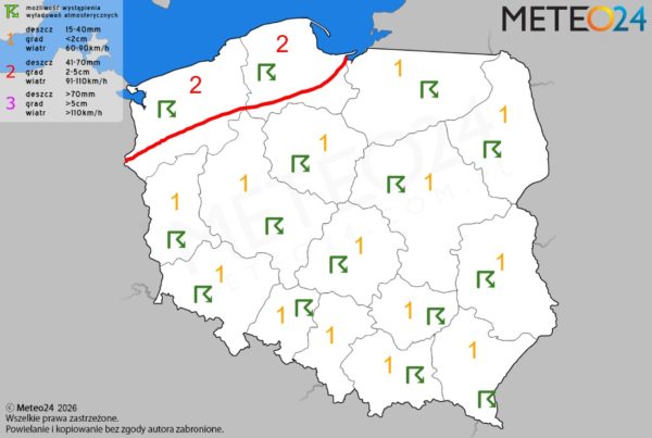 Opis: W ciągu doby nad wodami Morza Bałtyckiego oraz na przeważającym obszarze Polski i w górach ponownie będą rozwijać się pojedyncze komórki i pasma konwekcyjne, które przyniosą ze sobą przelotne oraz ciągłe opady deszczu i deszczu ze śniegiem o zmiennym i silnym natężeniu. Dodatkowo w tej części omawianego obszaru niewykluczone są też lokalne wyładowania atmosferyczne z opadami gradu lub krupy śnieżnej. W zamian tego ich głównym zagrożeniem będzie silny i bardzo silny wiatr w porywach dochodzący do nawet 90-110 km/h. Z tego względu dla naszego kraju i gmin nadmorskich został wydany pierwszy oraz drugi stopień zagrożenia.
