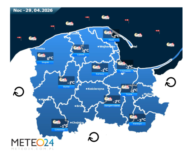 Natomiast noc z wtorku na środę i poranek na Pomorzu i Wybrzeżu ponownie może przynieść silne marznące mgły lub lokalne zamglenia. Poza tym będzie bez opadów oraz między innymi będzie pogodnie oraz też pojawi się małe i umiarkowane zachmurzenie. Temperatura powietrza wyniesie od -3°C do 0°C. Wiatr na ogół będzie słaby oraz umiarkowany i dość silny ze zmiennych kierunków z przewagą wiejący od północy oraz z północnego – wschodu i południowego – wschodu. Dodatkowo w porywach może on dochodzić do 30-60 km/h. Ciśnienie atmosferyczne w kolejnych godzinach będzie pomału rosnąć oraz o północy na poziomie morza wskaże 1028 hPa.