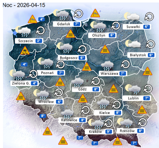 Natomiast noc z wtorku na środę i poranek w całym naszym kraju oraz nad morzem i w górach nadal mogą rozwijać się silne mgły lub lokalne zamglenia. W zamian tego utrzyma się z nami całkowite oraz umiarkowane i duże zachmurzenie z przejaśnieniami, które przyniesie ze sobą przelotne oraz ciągłe opady deszczu lub mżawki o słabym i silnym natężeniu. Jedynie bez opadów powinno być częściowo na północnym wschodzie Polski. Temperatura powietrza wyniesie od +4°C do +9°C. Wiatr przeważnie będzie słaby oraz umiarkowany i dość silny ze zmiennych kierunków z przewagą wiejący od południowego – wschodu oraz z północy i południowego – zachodu. Dodatkowo w porywach może on dochodzić do 30-60 km/h. Ciśnienie atmosferyczne w kolejnych godzinach będzie się wahać oraz o północy w Warszawie nad poziomem morza wskaże 1023 hPa.