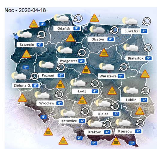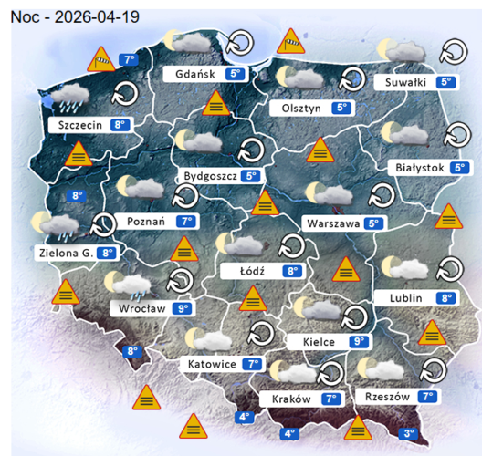 Z kolei w ostatni dzień weekendu przed południem oraz w ciągu dnia i wieczorem w całym naszym kraju oraz nad morzem i w górach ponownie możliwe są silne mgły lub lokalne zamglenia. Poza tym utrzyma się z nami całkowite oraz umiarkowane i duże zachmurzenie z przejaśnieniami, które jedynie na zachodzie oraz częściowo na północny i w Centrum Polski przyniesie ze sobą kolejne przelotne oraz ciągłe opady deszczu o zmiennym i silnym natężeniu. Dodatkowo na tym obszarze niewykluczone są też lokalne burze z gradem lub krupą śnieżną. Temperatura powietrza wyniesie od +14°C do +19°C. Wiatr na ogół będzie słaby oraz umiarkowany i silny ze zmiennych kierunków z przewagą wiejący od południowego – wschodu oraz ze wschodu i z północy. W zamian tego w porywach może on dochodzić do 60-80 km/h. Ciśnienie atmosferyczne w kolejnych godzinach nadal będzie spadać i wyraźnie się wahać oraz w południe w Warszawie nad poziomem morza wskaże 1019 hPa.