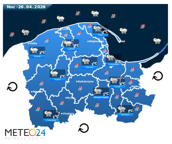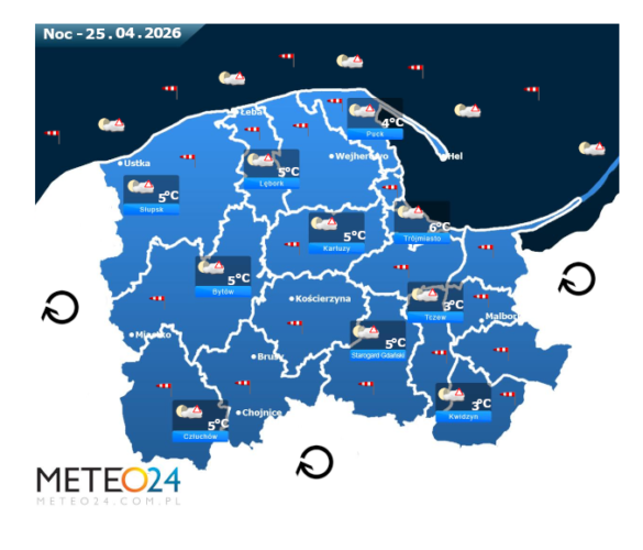 Natomiast noc z soboty na niedzielę i poranek na Pomorzu i Wybrzeżu ponownie może przynieść silne marznące mgły lub lokalne zamglenia. Poza tym utrzyma się z nami umiarkowane i duże zachmurzenie z przejaśnieniami, które już wszędzie przyniesie ze sobą przelotne oraz ciągłe opady deszczu o zmiennym i silnym natężeniu. Dodatkowo niewykluczone są też lokalne burze z gradem lub krupą śnieżną. Temperatura powietrza wyniesie od +1°C do +3°C. Wiatr przeważnie będzie umiarkowany i silny ze zmiennych kierunków z przewagą wiejący od północnego – zachodu oraz i z zachodu. Dodatkowo w porywach może on dochodzić do 60-90 km/h. Ciśnienie atmosferyczne w kolejnych godzinach pomału będzie rosnąć oraz o północy na poziomie morza wskaże 1006 hPa.