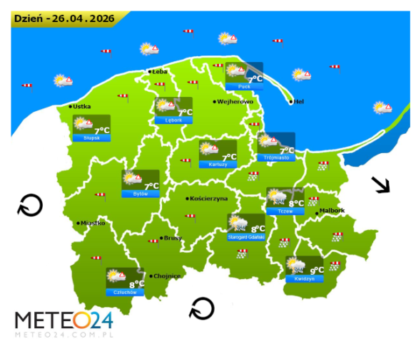 Z kolei w ostatni dzień weekendu przed południem oraz w ciągu dnia i wieczorem na Pomorzu i Wybrzeżu nadal możliwe są silne mgły lub lokalne zamglenia. Poza tym utrzyma się z nami małe i umiarkowane zachmurzenie, które jedyni na wschodzie i południowym wschodzie województwa przyniesie ze sobą przelotne opady deszczu i deszczu ze śniegiem o zmiennym i silnym natężeniu. Dodatkowo na tym obszarze niewykluczone są też lokalne burze śnieżne oraz z opadami gradu lub krupy śnieżnej. Temperatura powietrza wyniesie od +7°C do 9°C. Wiatr do godzin wieczornych na ogół będzie umiarkowany i silny z północnego zachodu i ze zmiennych kierunków z przewagą wiejący od zachodu i z południowego – zachodu. W zamian tego w porywach może on dochodzić do 60-80 km/h. Ciśnienie atmosferyczne w kolejnych godzinach będzie również rosnąć oraz w południe na poziomie morza wskaże 1018 hPa.