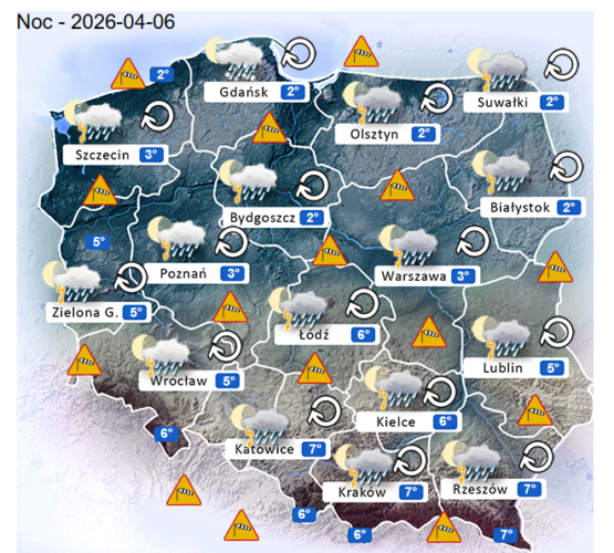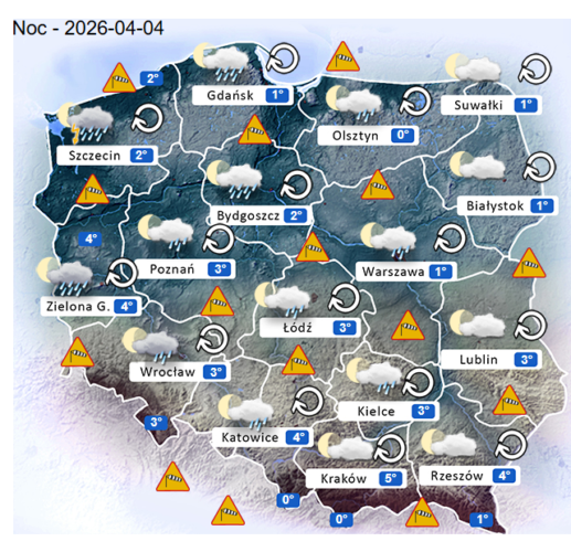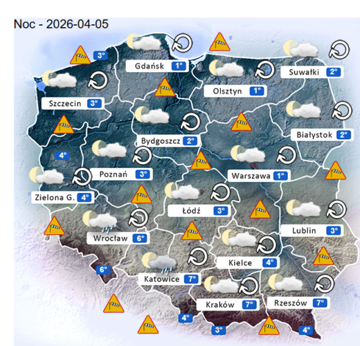 Natomiast noc z niedzieli na poniedziałek i poranek również w całym naszym kraju oraz nad morzem i w górach może przynieść silne mgły lub lokalne zamglenia. Poza tym utrzyma się z nami umiarkowane i duże zachmurzenie z przejaśnieniami, które przyniesie ze sobą przelotne oraz ciągłe opady marznącego deszczu i deszczu z śniegiem o zmiennym i silnym natężeniu. Dodatkowo niewykluczone są też burze z opadami gradu lub krupy śnieżnej. Temperatura powietrza wyniesie od +2°C do +7°C. Wiatr na ogół będzie słaby oraz umiarkowany i silny ze zmiennych kierunków z przewagą wiejący od północnego – zachodu oraz z zachodu i południowego – zachodu. W zamian tego w porywach może on dochodzić do 60-80 km/h. Ciśnienie atmosferyczne w kolejnych godzinach nadal będzie spadać i się wahać oraz o północy w Warszawie nad poziomem morza wskaże 1015 hPa.