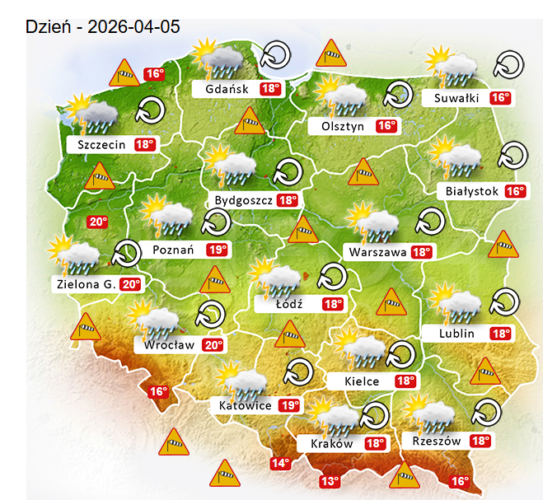 Z kolei w niedzielę Wielkanocną przed południem oraz w ciągu dnia i wieczorem w całym naszym kraju oraz nad morzem i w górach również możliwe są silne mgły lub lokalne zamglenia. Poza tym utrzyma się z nami umiarkowane i duże zachmurzenie z przejaśnieniami, które przyniesie ze sobą przelotne oraz ciągłe opady deszczu o zmiennym i silnym natężeniu. Dodatkowo niewykluczone są też burze z opadami gradu lub krupy śnieżnej. Temperatura powietrza wyniesie od +13°C do nawet +20°C. Wiatr na ogół będzie słaby oraz umiarkowany i silny ze zmiennych kierunków z przewagą wiejący od południa oraz z południowego – zachodu i północnego – zachodu. W zamian tego w porywach może on dochodzić do 60-100 km/h. Ciśnienie atmosferyczne w kolejnych godzinach nadal będzie wyraźnie się wahać i spadać oraz w południe w Warszawie nad poziomem morza wskaże 1018 hPa.