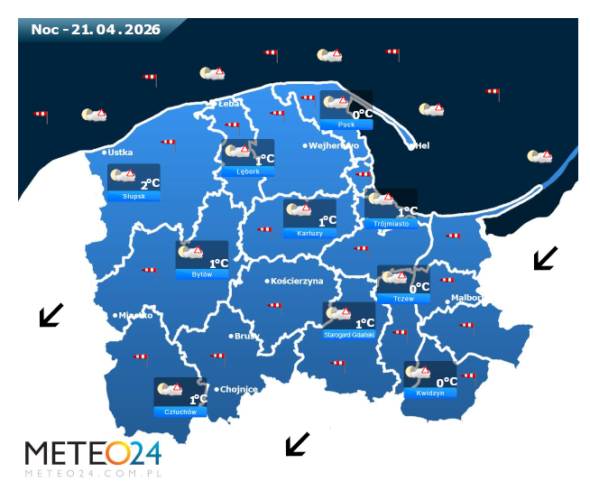 Natomiast noc z poniedziałku na wtorek i poranek na Pomorzu i Wybrzeżu nadal może przynieść silne marznące mgły lub lokalne zamglenia. W zamian tego będzie bez opadów oraz dodatkowo utrzyma się z nami małe i umiarkowane zachmurzenie. Temperatura powietrza wyniesie od 0°C do +2°C. Wiatr na ogół będzie słaby oraz umiarkowany i silny z północnego – wschodu. Dodatkowo w porywach może on dochodzić o 60-80 km/h. Ciśnienie atmosferyczne w kolejnych godzinach będzie się wahać i rosnąć oraz o północy na poziomie morza wskaże 1023 hPa.
