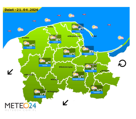 Z kolei we wtorek przed południem oraz w ciągu dnia i wieczorem na Pomorzu i Wybrzeżu ponownie mogą rozwijać się silne mgły lub lokalne zamglenia. Poza tym będzie bez opadów oraz między innymi utrzyma się z nami pogodne niebo oraz małe i też umiarkowane zachmurzenie. Temperatura powietrza wyniesie od +8°C do +12°C. Wiatr na ogół będzie słaby oraz umiarkowany i dość silny z północnego – wschodu i ze zmiennych kierunków z przewagą wiejący od północy i z północnego – zachodu. Dodatkowo w porywach może on dochodzić do 30-60 km/h. Ciśnienie atmosferyczne w kolejnych godzinach będzie dość stabilne i wysokie oraz w południe na poziomie morza wskaże 1026 hPa.